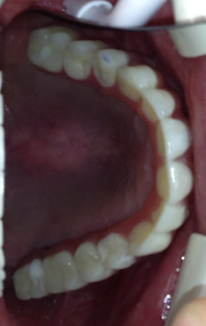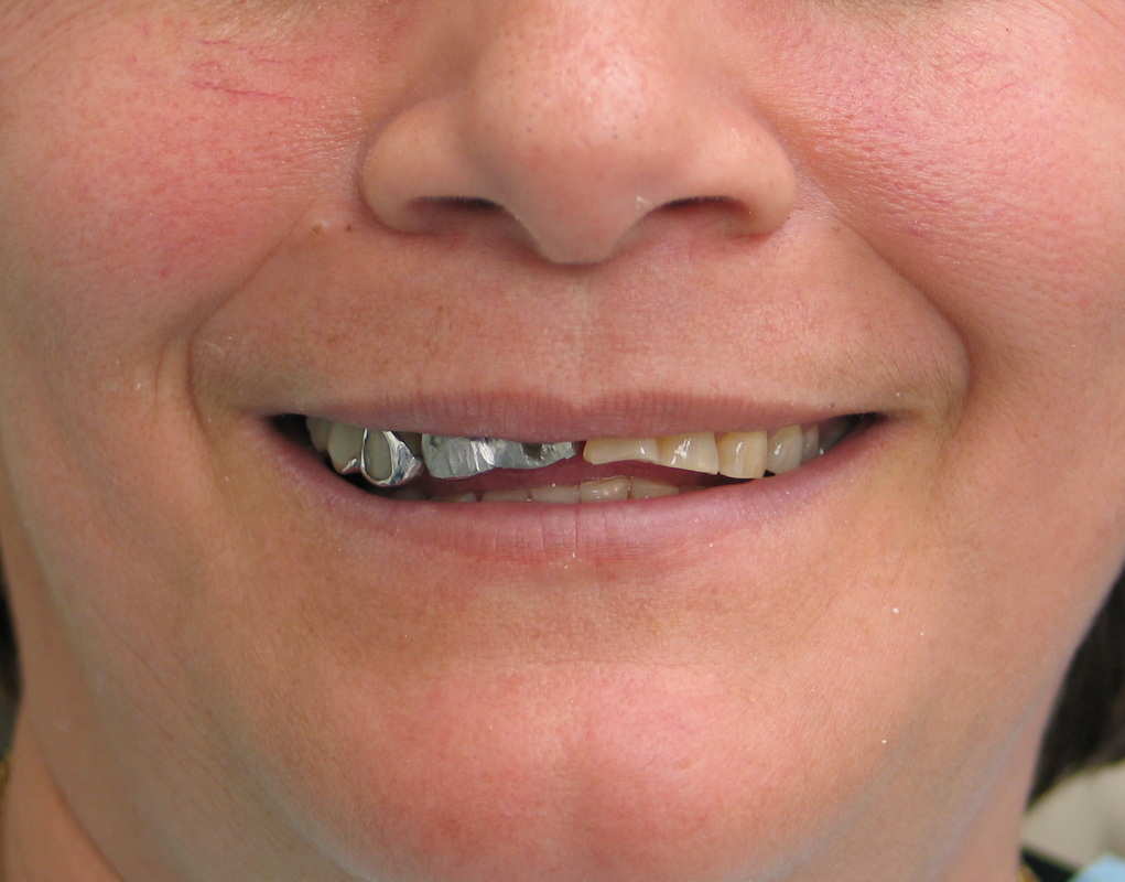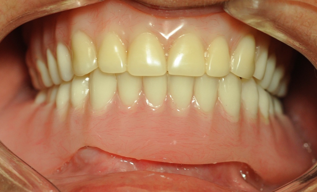 Collapsed bite had been opened with Gneuromuscular technique. Occlusion was equilibrated 2 weeks after delivery with TENS. Cavities on front teeth were filled with tooth-colored composite fillings.