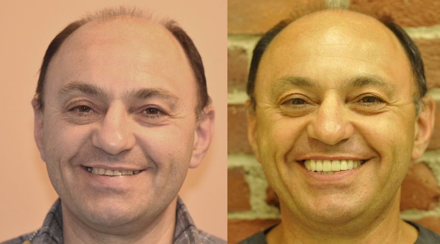 After thorough evaluation Dr. Andrews recommended ALL-ON-6 fixed implant bridge. The entire surgical stage, including extractions of all remaining upper teeth, bi-lateral sinus lift (right and left side), multiple bone grafts and placement of all 6 dental implants was accomplished by Dr. Andrews in one visit. Six months later the full upper arch dental implant bridge was delivered.