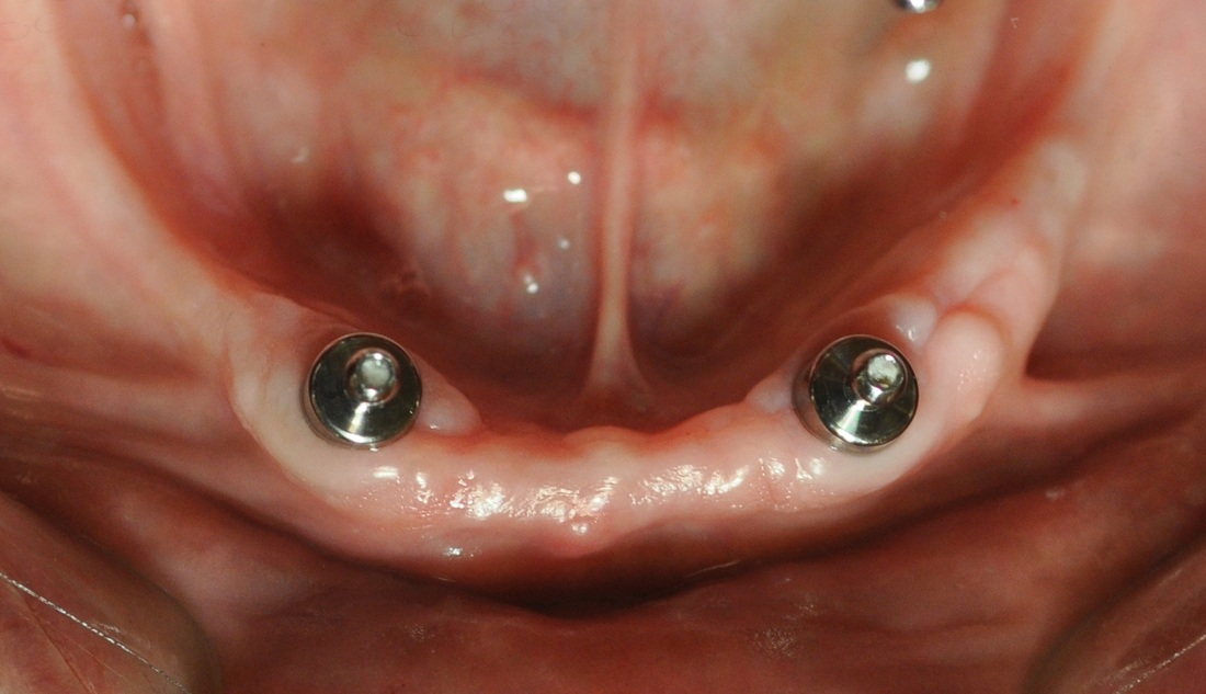 This patient’s existing old partial denture became loose after one of her teeth had broken. After thorough dental examination Dr. Andrews recommended to extract remaining lower teeth and immediately place two regular size dental implants in order to stabilize a new full lower denture.