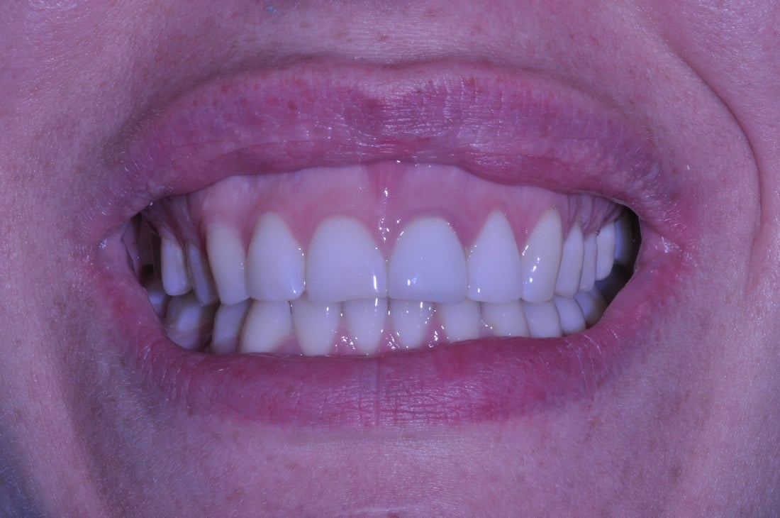 Once her new bite was established, the restorative phase of the cosmetic dental treatment had followed with 12 upper and 5 lower teeth receiving metal-free, all-ceramic restorations equilibrated into perfect balance with her muscles and joints (TMJ). Cavities on the remaining teeth were treated with conservative bio-mimetic, mercury-free composite white fillings.