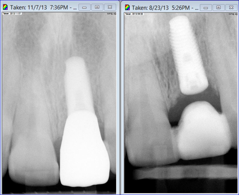 During only one 45-minute surgery both teeth were removed, a minor bone graft was placed and a wide-diameter (7 mm) dental implant was immediately inserted to replace the second molar. Four months later , #18 implant was restored with an all-ceramic crown.