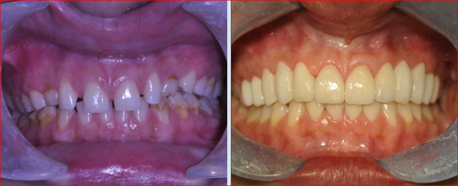 A patient presented with partial teeth loss, periodontal disease, vertical bite collapse, wear on remaining teeth and smile issues.