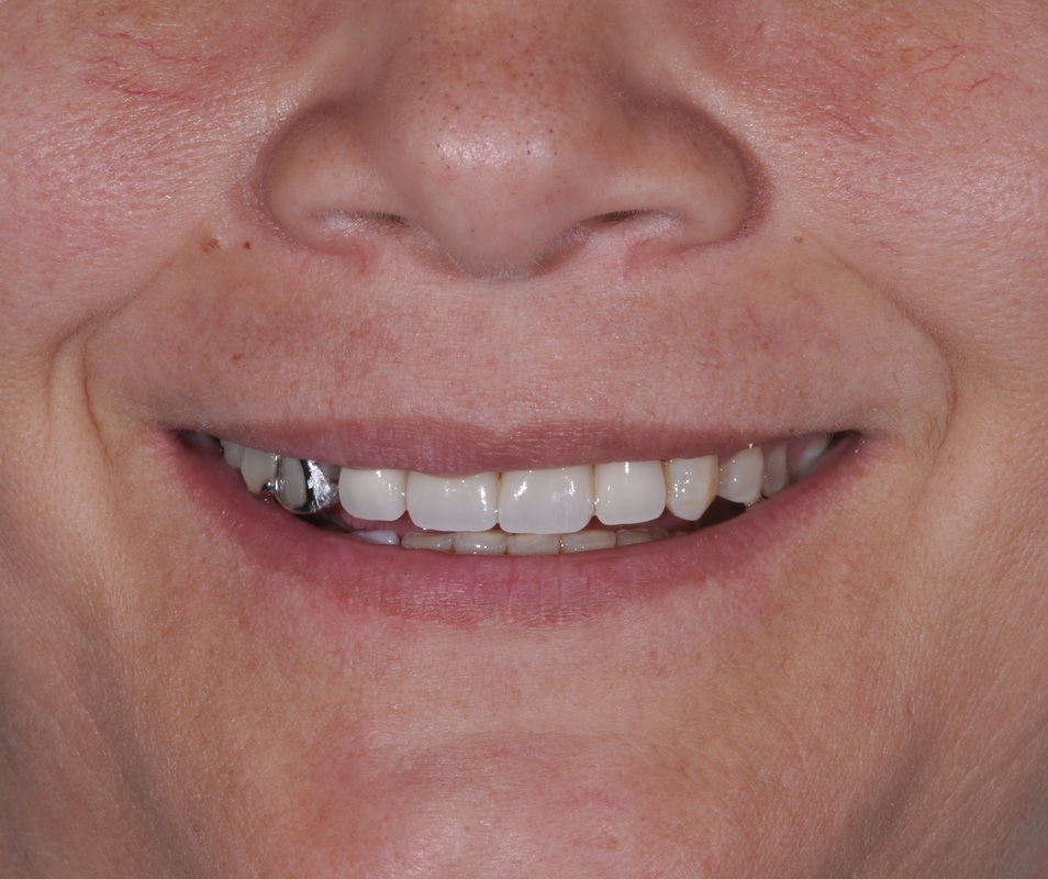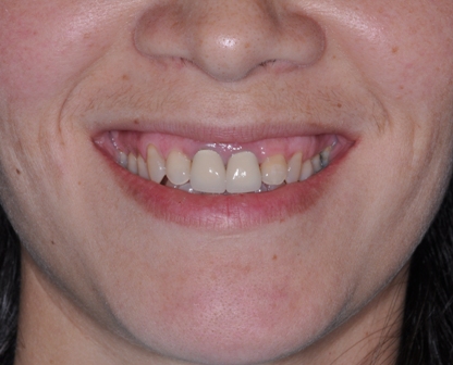 After thorough cosmetic evaluation, Dr. Andrews also suggested to do the laser gum re-contouring in order to reduce her “gummy smile”. The soft tissue diode laser was ideal to be used in this case. Two old upper front crowns were replaced with All-Ceramic crowns.