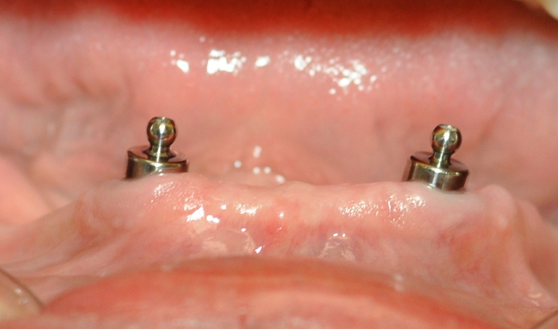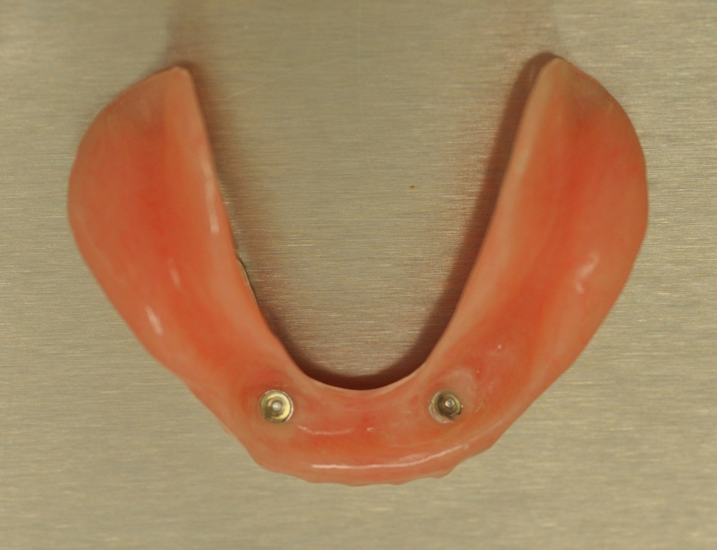 During only one surgery three lower teeth were removed, two dental implants were placed. Three months later two snap-on attachments were placed on the integrated implants.