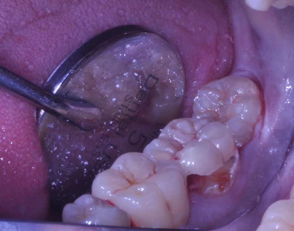 The patient suffers from Type 2 insulin-dependent diabetes. For unknown reason, the extraction site had not been closed with sutures by his previous dentist. On the second day after extraction, a “dry socket” had developed. This infection had caused moderate loss of bone due to the inflammatory process.