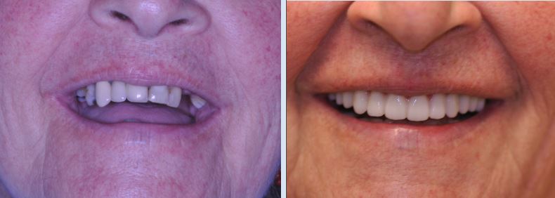 During a single surgery all remaining upper teeth were removed, bone grafts, sinus lifts were done and five dental implants were placed. A few months later this woman was smiling with a million-dollar smile she so long dreamed about.